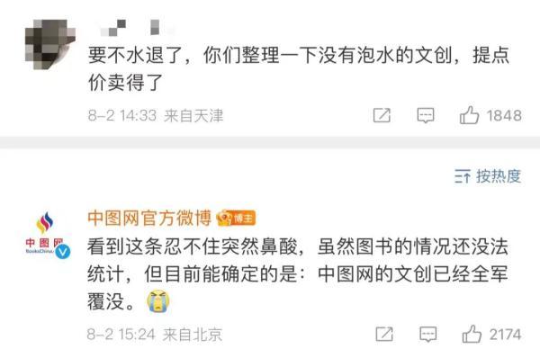记者注意到,在网友的一条“整理些文创进行销售”的提议评论下,@中图网官方微博表示,虽然图书的情况目前无法统计,但能确定的是:文创已经全军覆没。