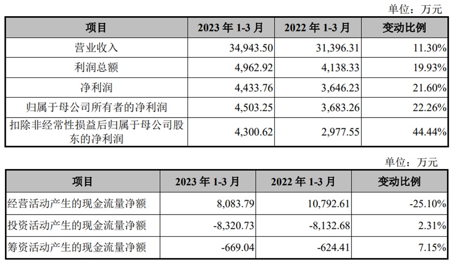 2023年1-3月,民爆光电实现营业收入34,943.50万元,较上年同期增长11.30%;实现净利润4,433.76万元,较上年同期增长21.60%;归属于母公司所有者的净利润4,503.25万元,较上年同期增长22.26%;扣除非经常性损益后归属于母公司股东的净利润4,300.62万元,较上年同期增长44.44%;经营活动产生的现金流量净额为8,083.79万元,较上年同期下降25.10%。