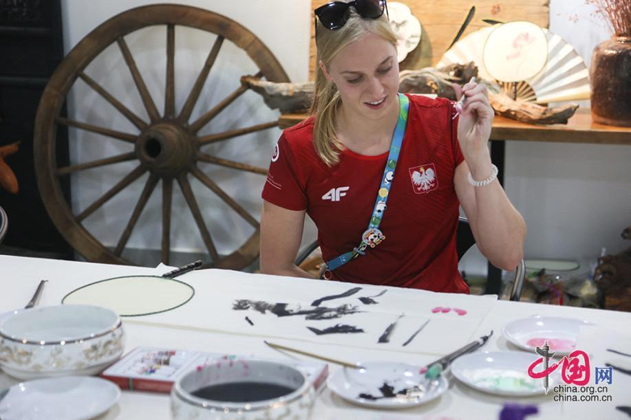 来自阿塞拜疆的运动员Lamiya Valiyeva小心翼翼地在团扇上完成了自己的国画作品。因为有着一定的绘画基础,她的作品还得到了老师的夸奖,这也让她十分开心。Lamiya Valiyeva是一名不折不扣的李小龙粉丝,她兴奋地向记者展示着自己手机中的李小龙壁纸。在完成一幅国画作品之后,Lamiya Valiyeva也对中国传统艺术有了自己的切身感受:“中国的绘画艺术非常不同,在完成作品时,我不需要用力去描绘,要轻轻地、温柔地去绘画,这是一种完全不同的表现形式。”