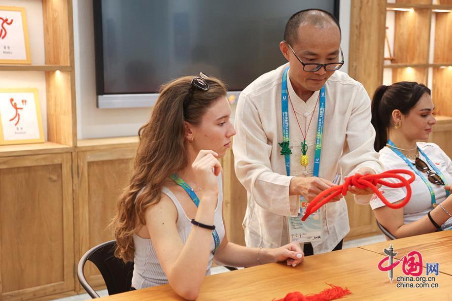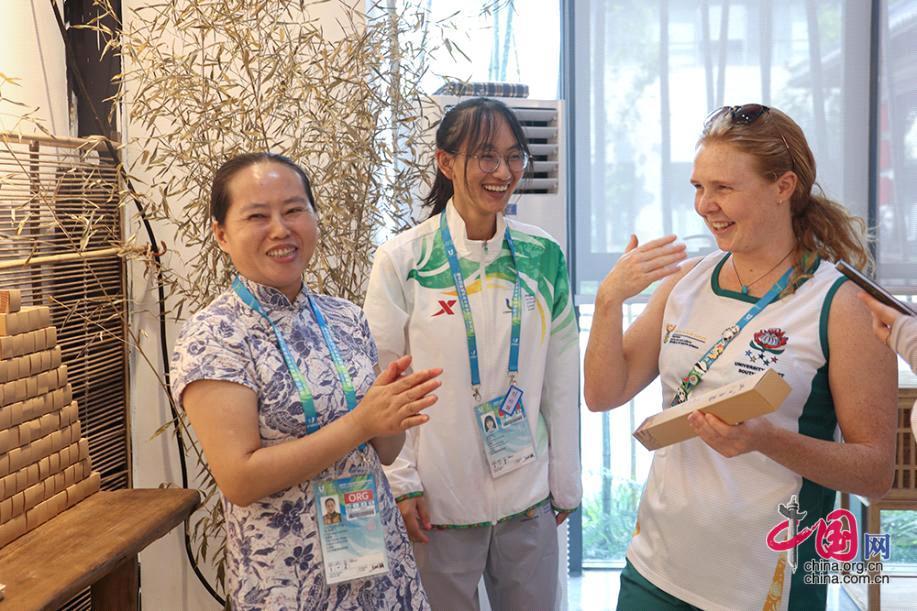 中国网成都8月3日讯(记者 伦晓璇) 作为成都第31届世界大学生夏季运动会最大的非竞赛场馆,大运村于7月22日正式开村。大运村是各参赛代表团居住生活的地方,更是文化交流的重要场所,在赛事运行期间,按照“简约、安全、精彩”的办赛要求,大运村内推出一系列丰富多彩的文化活动,促进文化交流互鉴,以艺通心、沟通世界。来自世界各地的运动员和代表团随行人员也在大运村内亲身体验着中国文化的无穷魅力。