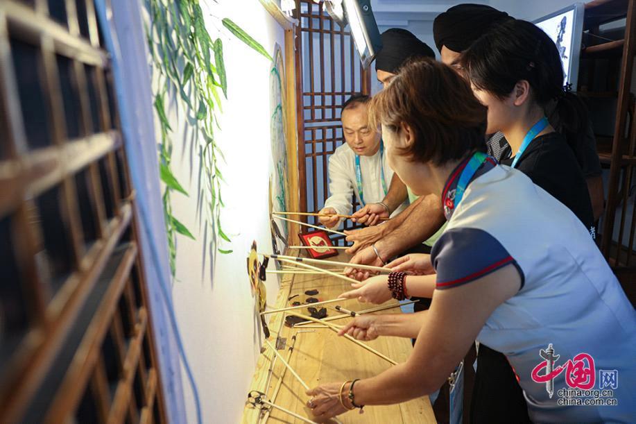 荷兰代表团教练Hugo de Thouars体验皮影表演。中国网记者 伦晓璇 摄