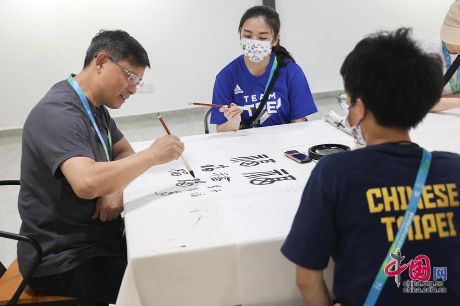 在外国运动员眼中,中国非遗文化和传统文化奥妙无穷,而对于中国运动员来说,传统文化也同样充满魅力。在汉服体验室里,一名中国运动员穿上汉服后,对着镜子美美记录下自己的 “新造型”,而在另一边的书法教室,四川师大书法学院教授王兴国正在向几名来自中国台北代表队的运动员演示不同“福”的写法:“写‘福’是中华民族的传统,尤其是在过年的时候,家家户户都要挂。”两岸文化同根同源,在王兴国的指导下,运动员们也认真地写起了“福”字。