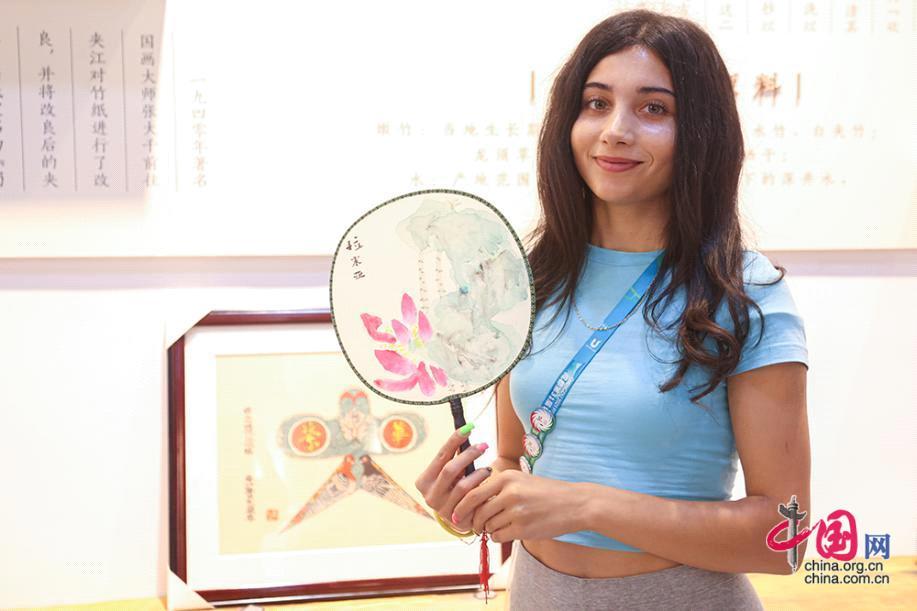 来自阿塞拜疆的运动员Lamiya Valiyeva与自己的国画作品合影。中国网记者 伦晓璇 摄