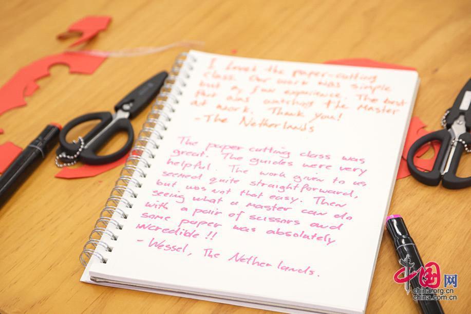 在剪纸体验区,荷兰运动员Wessel Hesselink收获了一枚来自彭州市非物质文化遗产剪纸传承人庄从灿为他剪制的侧脸轮廓作品,并在庄从灿的指导下体验了一把剪纸艺术。体验过后,Wessel Hesselink在留言本上认认真真写下了自己的心得:“老师给我们的任务似乎不复杂,但(对我来说)也没有那么容易,老师仅用一把剪刀和普通的一张纸便剪出作品,真的令人难以置信”。