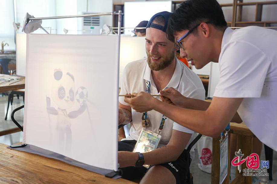 在皮影戏表演室,荷兰代表团教练Hugo de Thouars正与几名运动员一同体验皮影艺术。在老师的指导下,他手中的熊猫皮影也逐渐在幕布上“活”了起来。“这是一次非常新奇的体验,也希望能体验到更多不同的传统中国文化”,初次接触皮影戏的Hugo de Thouars兴奋地说。