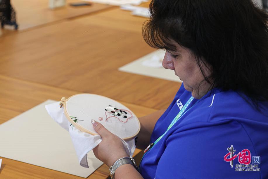 一名运动员体验蜀绣,并绣下自己和丈夫的中文名字。中国网记者 伦晓璇 摄