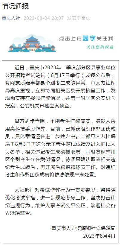 近日,重庆市2023年二季度部分区县事业单位公开招聘考试笔试(6月17日举行)成绩公布后,有网友质疑丰都县个别考生成绩异常。市人力社保局高度重视,立即协同相关区县开展核查工作,发现确实存在疑似作弊情况,并第一时间向公安机关报案,公安机关迅速立案侦查。