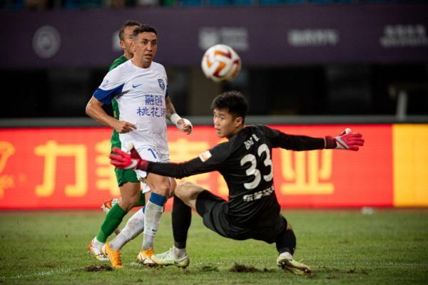 8月4日,武汉三镇队球员戴维森(左前)在比赛中射门。