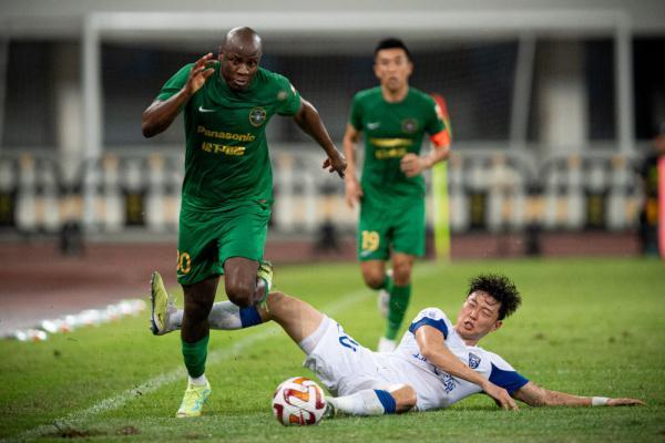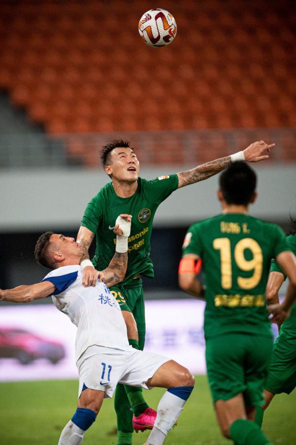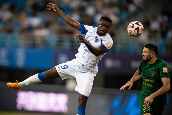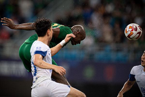 8月4日,武汉三镇队球员阿齐兹(左)在比赛中争顶头球。