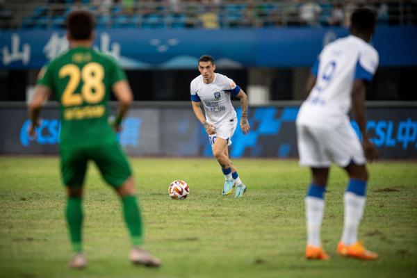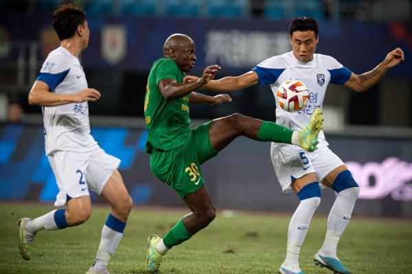 8月4日,武汉三镇队球员斯坦丘(中)在比赛中进攻。