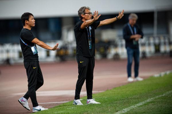 8月4日,武汉三镇队主教练高畠勉(左二)在比赛中指挥。