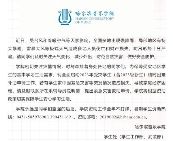 哈尔滨音乐学院全面启动2023年受灾学生(含2023级新生)临时困难补助申请工作。通知称,学院资助工作全年不打烊,若有学生家中因紧急灾害等突发情况造成损失,导致家庭经济困难,请及时联系所在系辅导员说明情况,提出紧急灾害救助申请,学院将根据资助政策切实保障学生安心学习生活。暑期学生资助热线:0451-58597690/13904511691。