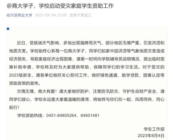 黑龙江大学、哈尔滨商业大学相继发布通知称,启动因自然灾害受灾学生临时困难补助工作。如同学们(包括2023级新生)家中因台风、暴雨等自然灾害或其他意外,导致家庭经济出现临时困难,可在第一时间向辅导员说明情况,学校将竭力为同学们排忧解难,切实帮助受灾学生平稳渡过难关。