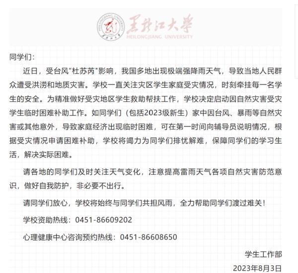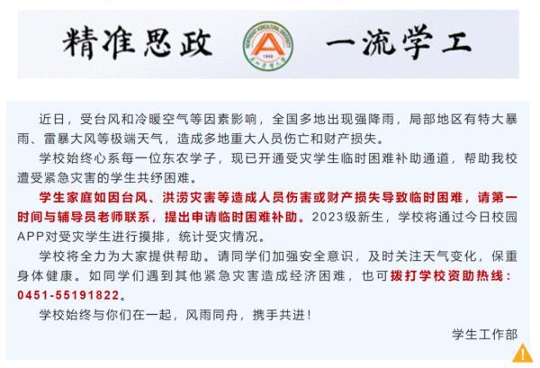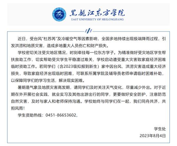 黑龙江东方学院立即启动遭受重大灾害致家庭经济困难临时资助工作。通知称,若同学们(含2023级拟报到新生)家中因台风、洪涝灾害造成重大经济损失,导致家庭经济出现临时困难,请联系所属学院及辅导员老师申请临时困难补助,以保障同学们的学习生活,解决现实困难。对于近期在外开展社会实践、就业实习及其他出游出行的同学,要做好安全防护,注意防范自然灾害,及时与家人和老师保持沟通。学生资助热线:0451-86653602。