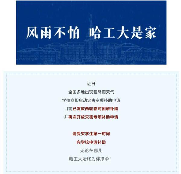 哈尔滨工业大学已陆续启动两轮学生家庭受灾情况摸排和灾害专项补助申请,现再次开放临时困难补助申请。通知称,在读学生,如遇困难,请第一时间联系辅导员进行申请,学校会第一时间发放专项补助;对于暂未入学的2023级新生,学校将通过迎新系统和哈工大APP对受灾新生进行摸排,统计受灾情况,一对一发放专项补助。“困难不怕,哈工大是家”,无论在哪儿,哈工大始终为你撑伞!学生资助热线:0451-86418141,学工部长热线:0451-86417771。