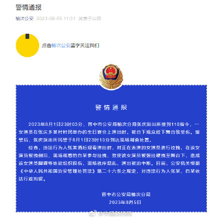 8月5日,山西省晋中市公安局榆次分局通报:8月1日23时03分,晋中市公安局榆次分局张庆派出所接到110指令,一女演员在张庆乡某村村民举办的生日宴会上演出时,被台下观众拉下舞台致受伤。经查,违法行为人张某酒后观看演出时,对正在表演的女演员进行拉拽,在该女演员被拽倒后,现场观看的白某参与拉拽,致使该女演员被强拉硬拽至舞台下,造成该女演员脚踝等处软组织损伤,现场秩序混乱,演出被迫中断。目前,公安机关根据《中华人民共和国治安管理处罚法》第二十六条之规定,对违法行为人张某、白某依法行政拘留。(榆次公安)