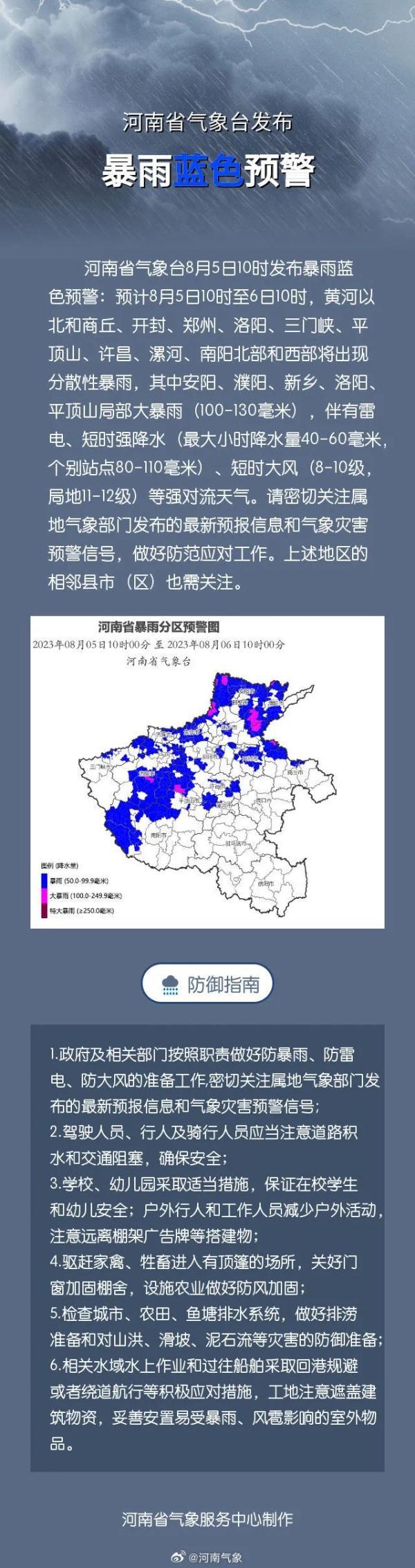 河南省气象台8月5日10时发布暴雨蓝色预警:预计8月5日10时至6日10时,黄河以北和商丘、开封、郑州、洛阳、三门峡、平顶山、许昌、漯河、南阳北部和西部将出现分散性暴雨,其中安阳、濮阳、新乡、洛阳、平顶山局部大暴雨(100-130毫米),伴有雷电、短时强降水(最大小时降水量40-60毫米,个别站点80-110毫米)、短时大风(8-10级,局地11-12级)等强对流天气。请密切关注属地气象部门发布的最新预报信息和气象灾害预警信号,做好防范应对工作。上述地区的相邻县市(区)也需关注。