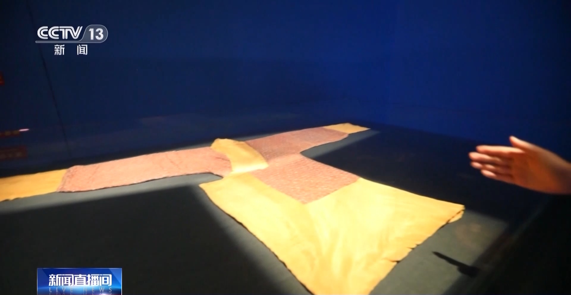总台记者 姜文婧:这件同样来自马王堆一号汉墓的稀世瑰宝——印花敷彩纱丝绵袍,是世界上发现最早将印花和彩绘结合起来的丝织品。如果说素纱襌衣是如梦如幻,这件丝绵袍就是低调的奢华,衣物大面积运用了印花敷彩的纱,制作时需要先用戳印的方式印花,然后用蘸有不同颜色的画笔描绘着色,形成有枝蔓、蓓蕾、花蕊、叶子等各种形状的花纹。