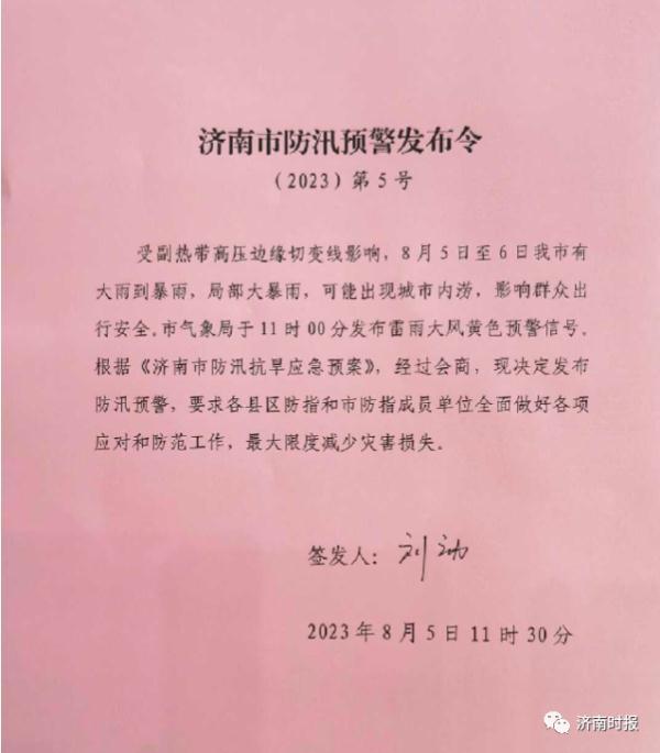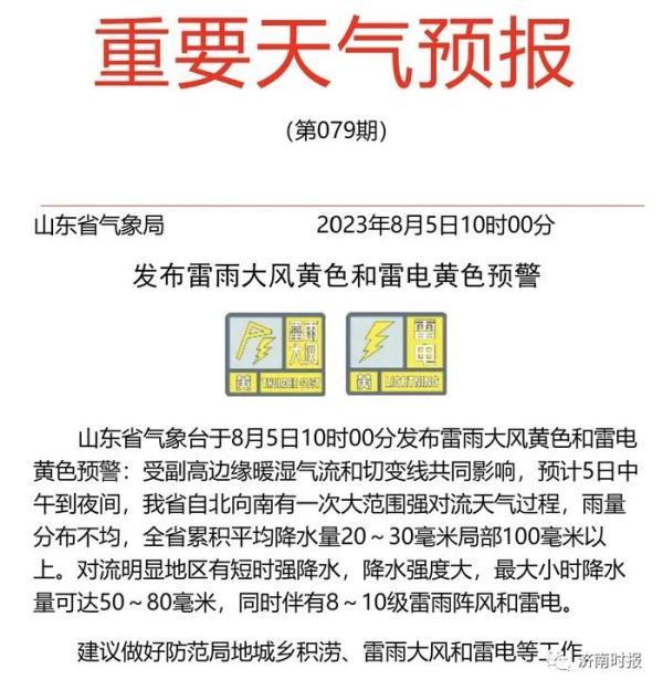 目前德州至聊城一带已经出现强降雨回波,预计5日下午至6日早晨济南全部区县都将出现雷阵雨天气,雷雨时阵风7~9级,局部10级,伴有短时强降雨。