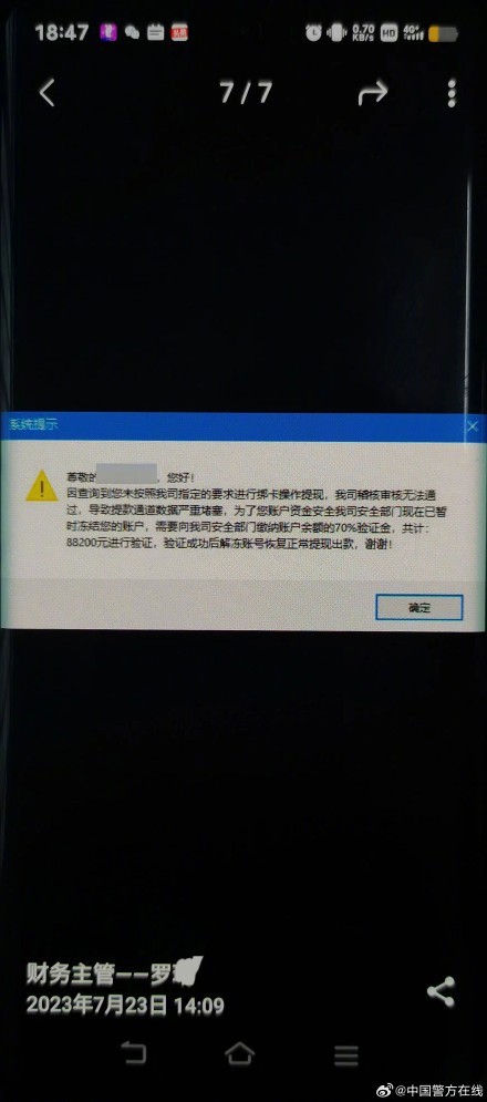 骗子为了骗取钱财,可谓“煞费苦心”,先用“约会”诱惑引流,再来“刷单返利”,且只说这样操作是为了激活会员卡,只字不提“刷单”,迷惑性陡增。近日,丹阳市公安局横塘派出所民警上门劝阻汪先生时,见其深信不疑,便“精准预言”了骗子的操作:“这样吧,你就在我面前,跟对方联系退款事项,我预言对方会说你的卡被冻结了,还需要继续交钱解冻账号。果不其然,汪某与所谓“财务主管”联系后,对方发来一张显示为“系统提示”的图片,声称要转账解冻云云。民警“预言”成真了,汪某才恍然大悟,避免了继续被骗。
