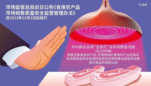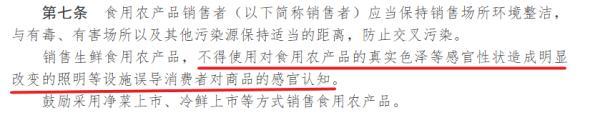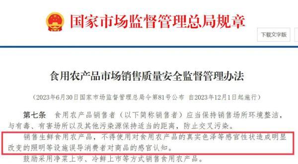 近日,国家市场监管总局修订发布的《食用农产品市场销售质量安全监督管理办法》中明确提到:销售生鲜食用农产品,不得使用对食用农产品的真实色泽等感官性状造成明显改变的照明等设施误导消费者对商品的感官认知。