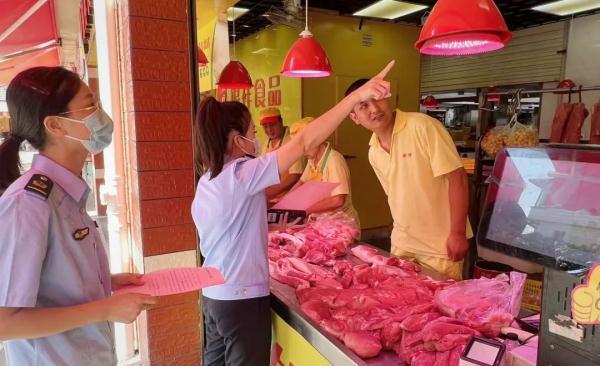 执法人员针对使用生鲜灯的商户进行普法宣传,告知经营者自今年12月1日起使用“生鲜灯”属于违法行为,劝导商户自觉更换普通照明灯,逐步摒弃这种商品“美颜神器”。