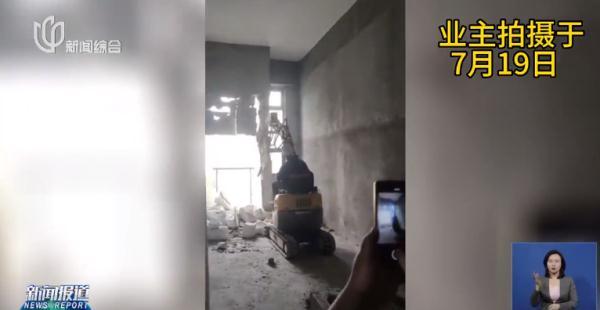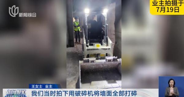 我7月19号跟一些业主代表进这栋楼查看。物业告诉我们,他们不是在装修,而是在清理垃圾。我们看到10楼跟9楼的大多数墙体严重破损、钢筋裸露,场景触目惊心。当时破碎机和铲车都在现场施工,我们拍下用破碎机将墙面全部打碎的画面。这栋楼一共住了700户居民,我们非常担心是否敲了承重墙。