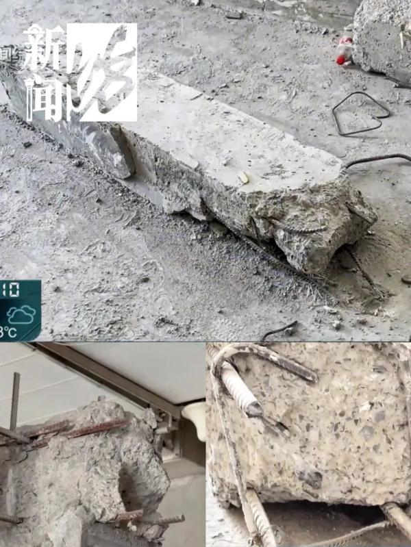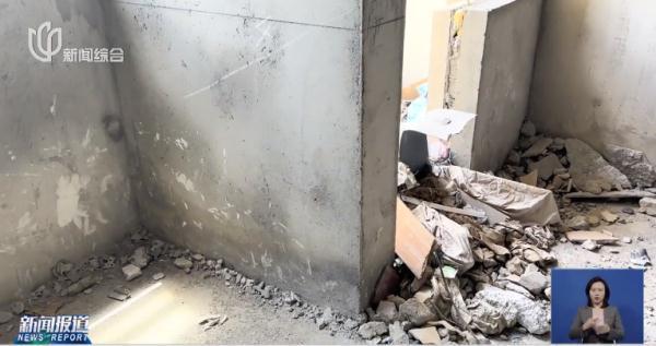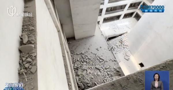 他们拆除的位置我们也去看过了,阳台的墙比较挡光,我们都想把它敲掉,这样光线会更好一点。但物业告诉我们这个是承重墙,不允许我们拆除,但现在那面墙明显已经敲掉了。我拍的镜头是7月19日的,8月1日的一个视频显示从7楼到6楼直接砸穿了,如果人从旁边经过,掉下来后果不可想象。
