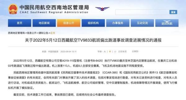 据中国民用航空西南地区管理局网站4日消息,中国民航局发布关于2022年5月12日西藏航空TV9833航班偏出跑道事故调查进展情况的通报。