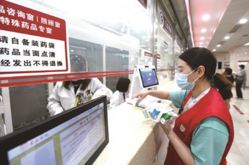 身着红马甲的华山医院陪诊志愿者帮助病人配药 本版摄影 本报记者 徐程