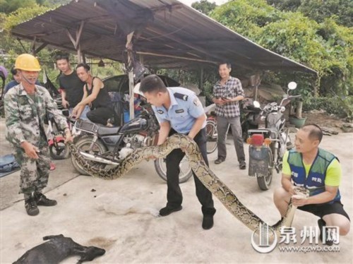 早报讯 (记者陈祥木 苏玮杰 通讯员林毅鑫文/图)“警察同志,我家的羊被蛇吃了,你们快来!”近日,安溪县公安局西坪派出所接到辖区群众的求助。民警化身“捕蛇人”,将蛇擒获并放生。