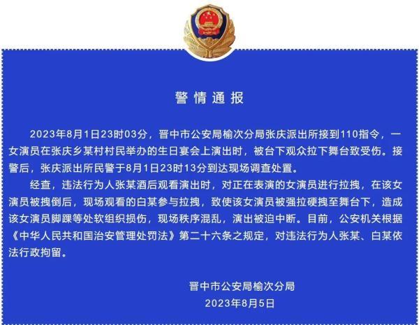 2023年8月1日23时03分,晋中市公安局榆次分局张庆派出所接到110指令,一女演员在张庆乡某村村民举办的生日宴会上演出时,被台下观众拉下舞台致受伤。