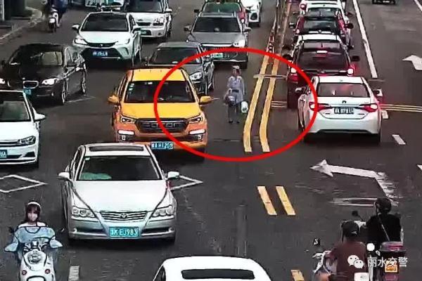 一位老人正在机动车道中央步履蹒跚地行走