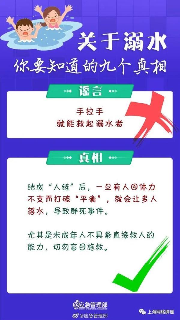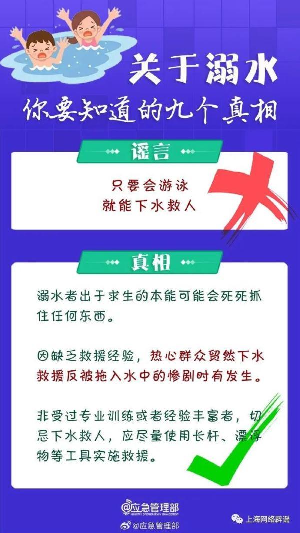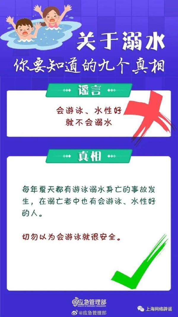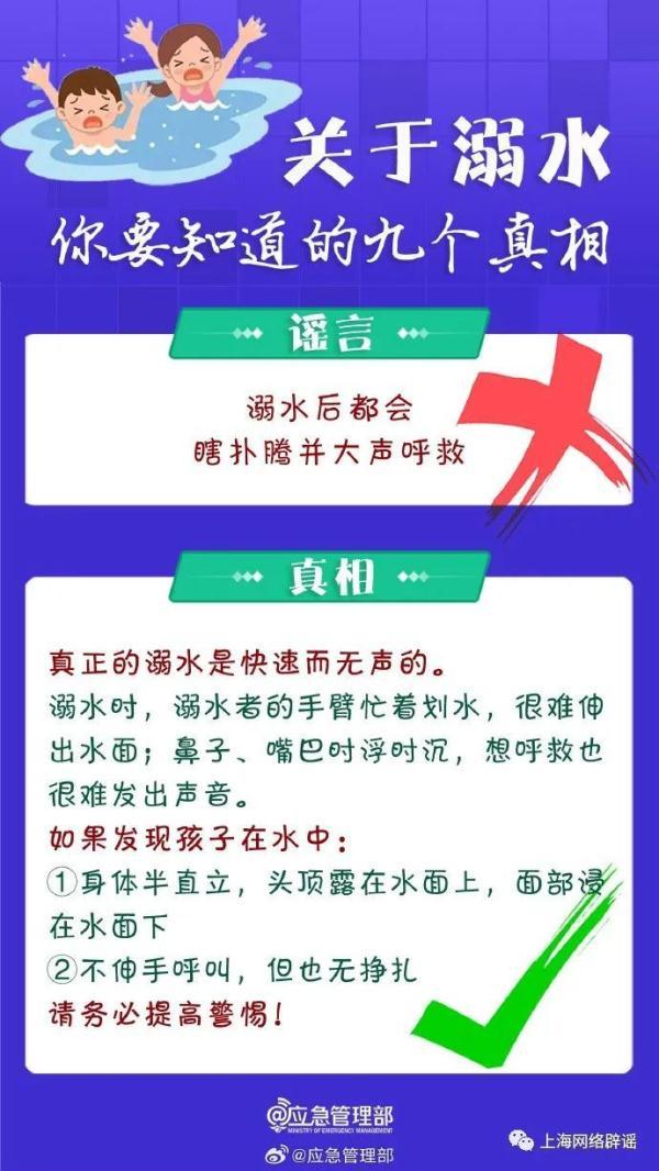 应急管理部同时指出,公众对“溺水”存在一定的误区,比如认为“会游泳、水性好就不会溺水”“有游泳圈就不会溺水”等。对此,应急管理部整理了有关溺水的九大谣言和相关真相,提醒公众尤其是家长,注意预防。