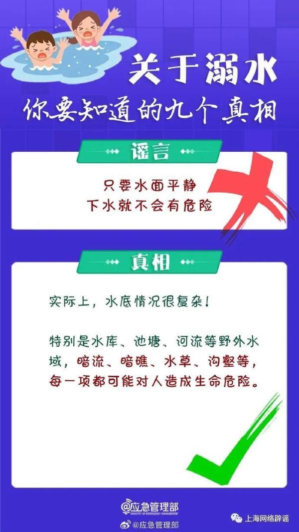 眼下正逢暑期,学生涉水、游泳等行为增多,由此导致的溺水身亡事件时有发生。上海辟谣平台注意到,入夏以来,国家应急管理部已多次通过官方微博、公众号发布提醒公众,珍爱生命,预防溺水。