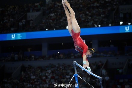 8月5日下午,来自北京师范大学的中国选手杜思雨以13.833分获得成都大运会体操女子高低杠冠军,德国选手索菲亚·赛琳娜获得银牌,另一名中国选手罗欢获得铜牌。(中青报·中青网记者慈鑫/文赵迪/摄)
