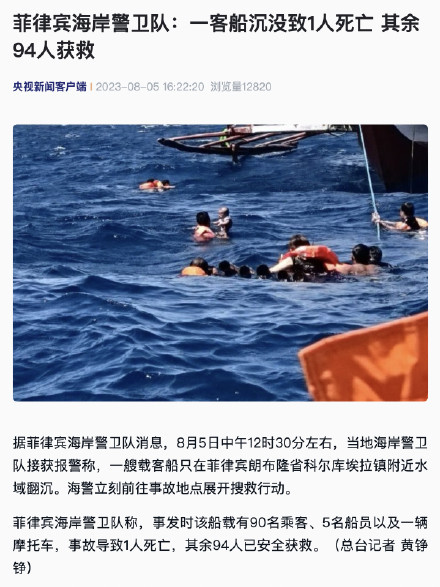 菲律宾海岸警卫队称,事发时该船载有90名乘客、5名船员以及一辆摩托车,事故导致1人死亡,其余94人已安全获救。(央视)