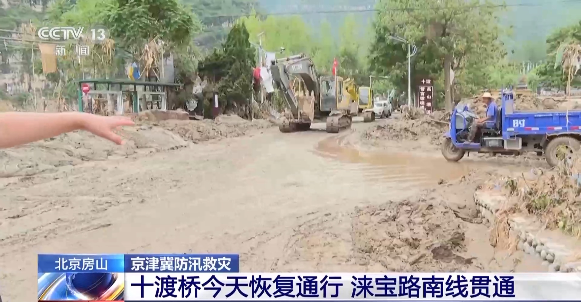 总台记者 张景:挖掘机已经可以顺利通过十渡桥到镇子里面去清淤泥,包括到镇子更上游的地方,进一步抢通受损道路和桥梁。经过紧急抢修,桥面与外界进行了连通。通过这座桥连通涞宝路,通过涞宝路就可以到达张坊镇,进一步到房山城区,再到北京的中心城区。涞宝路的南线打通之后,相关物资、抢险车辆就可以方便地进入十渡的核心地区了。