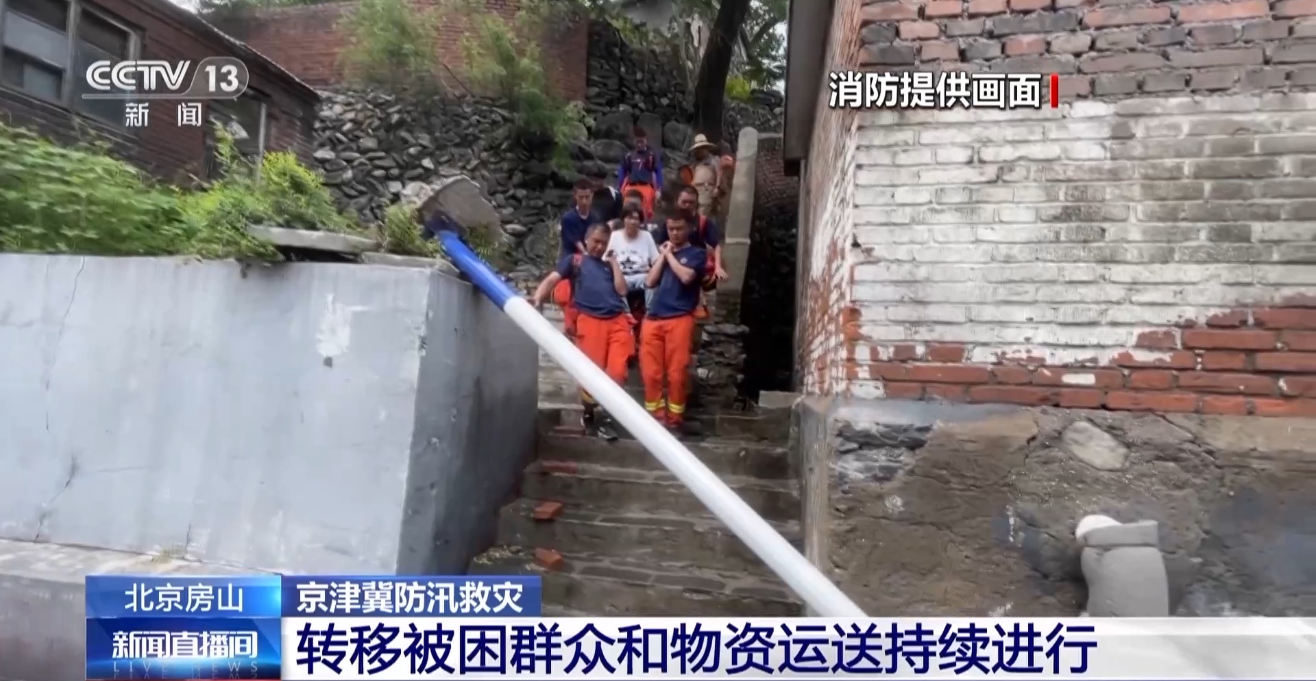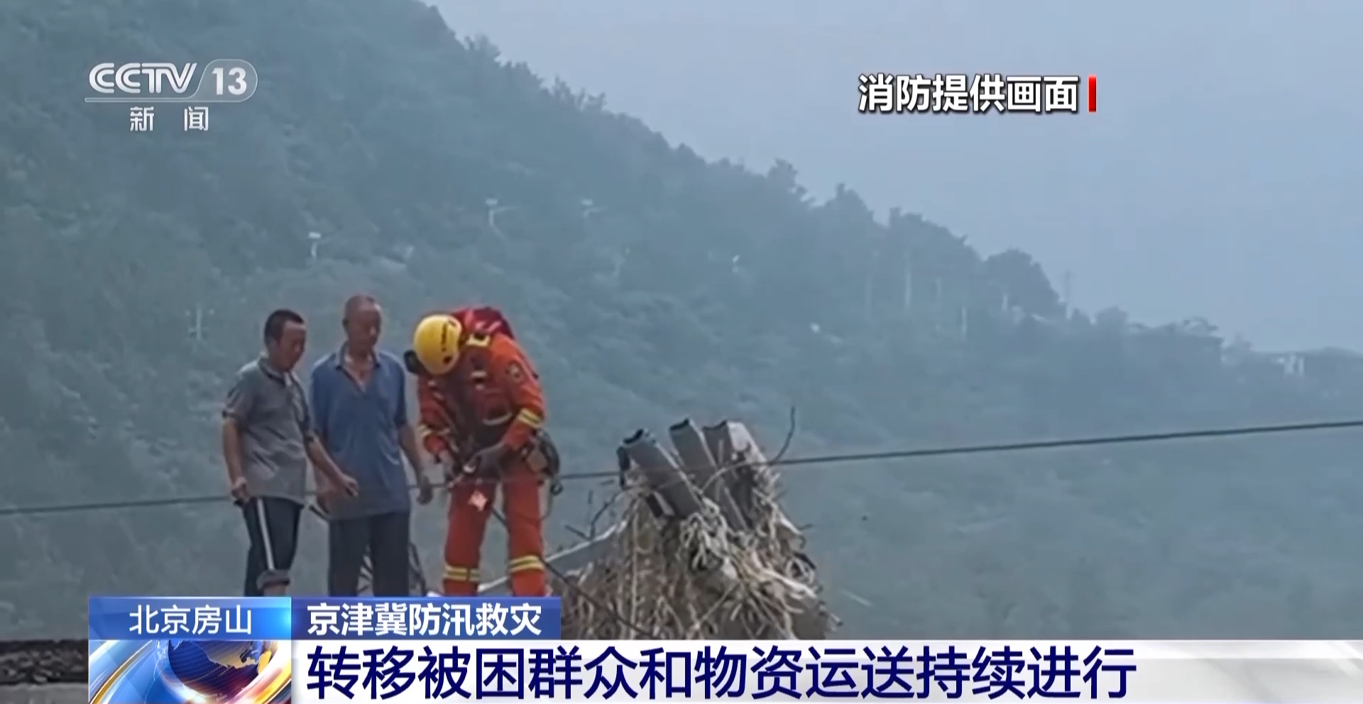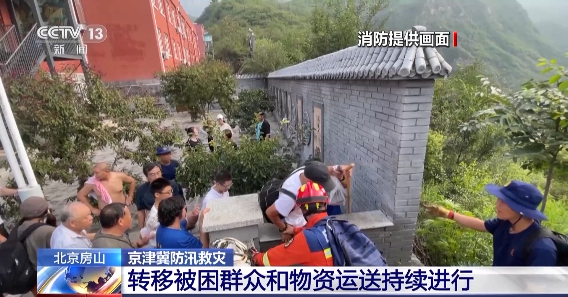在北京房山十渡镇和史家营乡,多个村庄发生人员被困情况,消防员接到命令后持续进行人员搜救和物资投送工作。