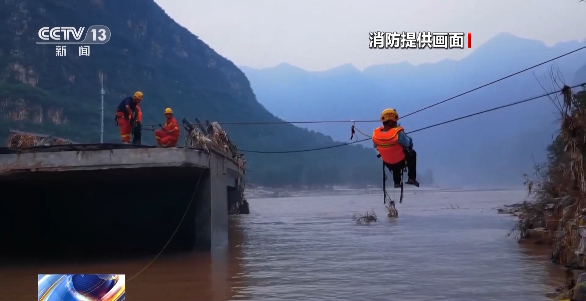 8月4日上午,在十渡镇套港村,有2名群众需要转移。由于17渡桥桥头被山洪冲断,桥头在山脚下,山上随时有滚石下落的危险,脚下又是湍急的河流,给消防员救援带来了一定难度。