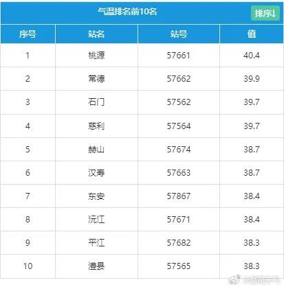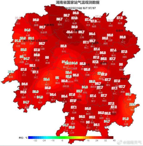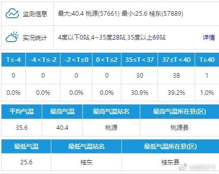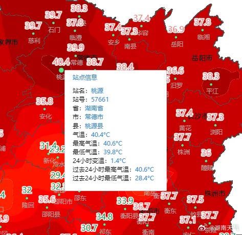湖南省国家站气温观测数据显示,5日16时湖南69县市区气温达35℃,其中大部气温在37℃以上,全省气温达到或超过39℃的县市区有4个(桃源、常德、石门、慈利),其中桃源气温全省最高,达40.4℃。