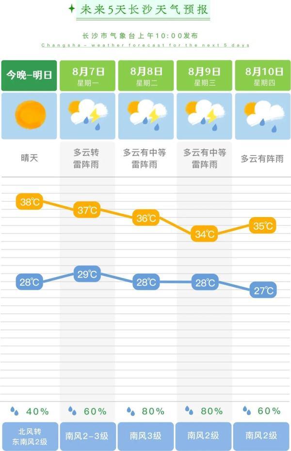 5日20时至6日20时,晴天间多云,大部地区有阵雨或雷阵雨,其中怀化南部、邵阳南部局地中雨;南风2~3级;最高气温湘西、湘南34~36℃,其他地区37~39℃;最低气温湘西23~25℃,其他地区26~28℃。