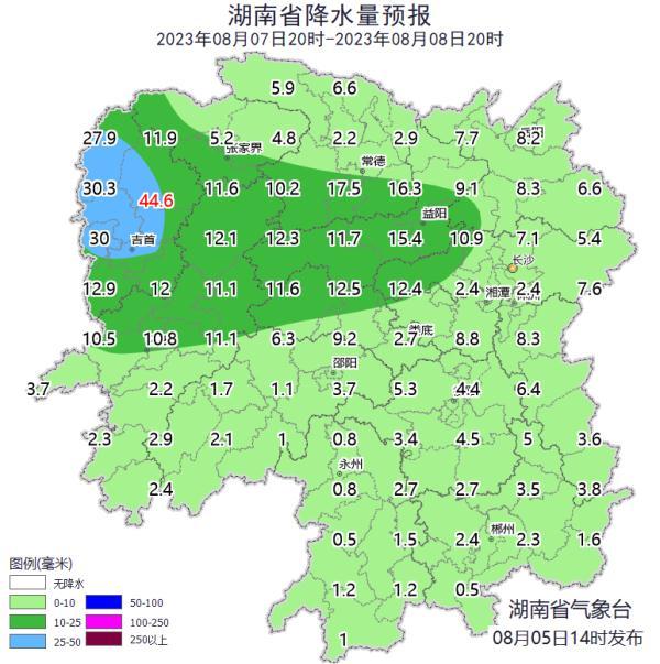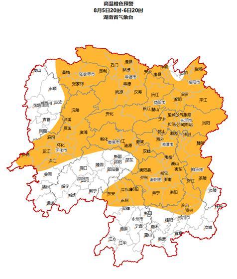 预计5日20时至6日20时,长沙、株洲、湘潭、衡阳、岳阳、常德、张家界、益阳、郴州北部、永州北部、怀化中北部、娄底将达到37℃以上高温,其中张家界、常德、益阳局部地区将达39℃以上,请做好防范。