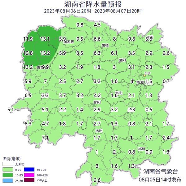 6日20时至7日20时,晴天到多云有阵雨或雷阵雨,其中张家界西部、湘西州局地中雨;南风2~3级;最高气温湘西、湘北33~35℃,其他地区36~38℃;最低气温湘西23~25℃,其他地区27~29℃。