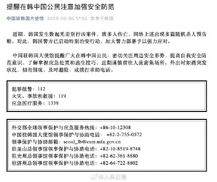 近期,韩国发生数起无差别行凶案件,致多人伤亡,网络上还出现多篇随机杀人预告贴。对此,韩国警方已启动特别治安行动,加大警力部署予以强力应对。中国驻韩国大使馆提醒广大在韩中国公民:密切关注周边安全形势,提高自我安全防范意识,了解掌握应急处置和逃生技巧,近期谨慎前往人流密集场所。外出时如遇突发状况,切勿围观,及时避险,或拨打求助电话。