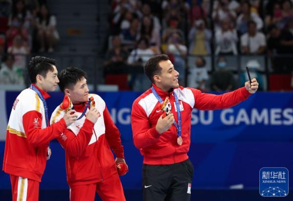 ↑冠军中国选手兰星宇(中)、亚军中国选手邹敬园(左)和季军土耳其选手阿西尔在颁奖仪式上自拍。新华社记者 王婧嫱 摄