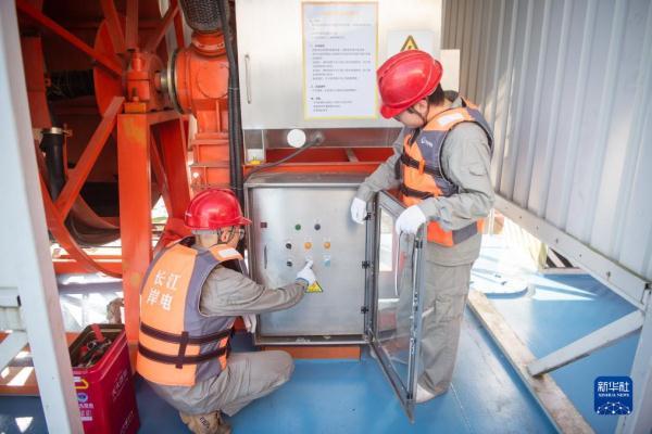 8月4日,国家电网宜昌供电公司岸电运维人员在秭归港对高压电缆卷筒进行实验性操作,确保汛期设备稳定运行。
