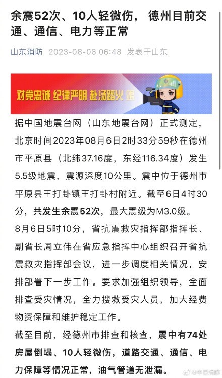 2023年8月6日02时33分,德州市平原县发生5.5级地震。截至6日4时30分,共发生余震52次。截至目前,经德州市排查和核查,震中有74处房屋倒塌、10人轻微伤,道路交通、通信、电力保障等情况正常,油气管道无泄漏。