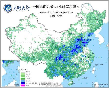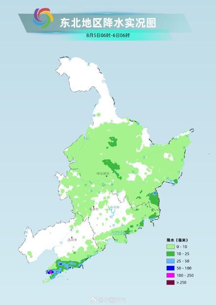 中国气象局气象探测中心综合气象观测产品系统(天衡天衍)显示,05日06时至06日06时,辽宁南部、天津、河北南部、山东、河南、四川东部、广西南部、云南等地有较强降水,局地有大暴雨。24小时最大累积降水量241.2毫米,发生在辽宁瓦房店泡崖。24小时最大1小时累积降水量102.9毫米,发生在河北阜城码头,发生时间05日11时。