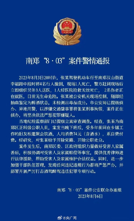 8月3日20时许,张某驾驶机动车行至陕西南郑汉山街道幸福路中段时将4名行人撞倒,1人当场死亡,1人经医院抢救无效死亡,2名伤者正在就医,目前无生命危险。张某被公安机关现场控制,随即经抽血鉴定为醉酒状态,未检测出毒品成分。市公安局已提级侦办、异地用警,以涉嫌交通肇事罪将张某刑事拘留,案件正在侦办,将坚决依法严惩犯罪嫌疑人。